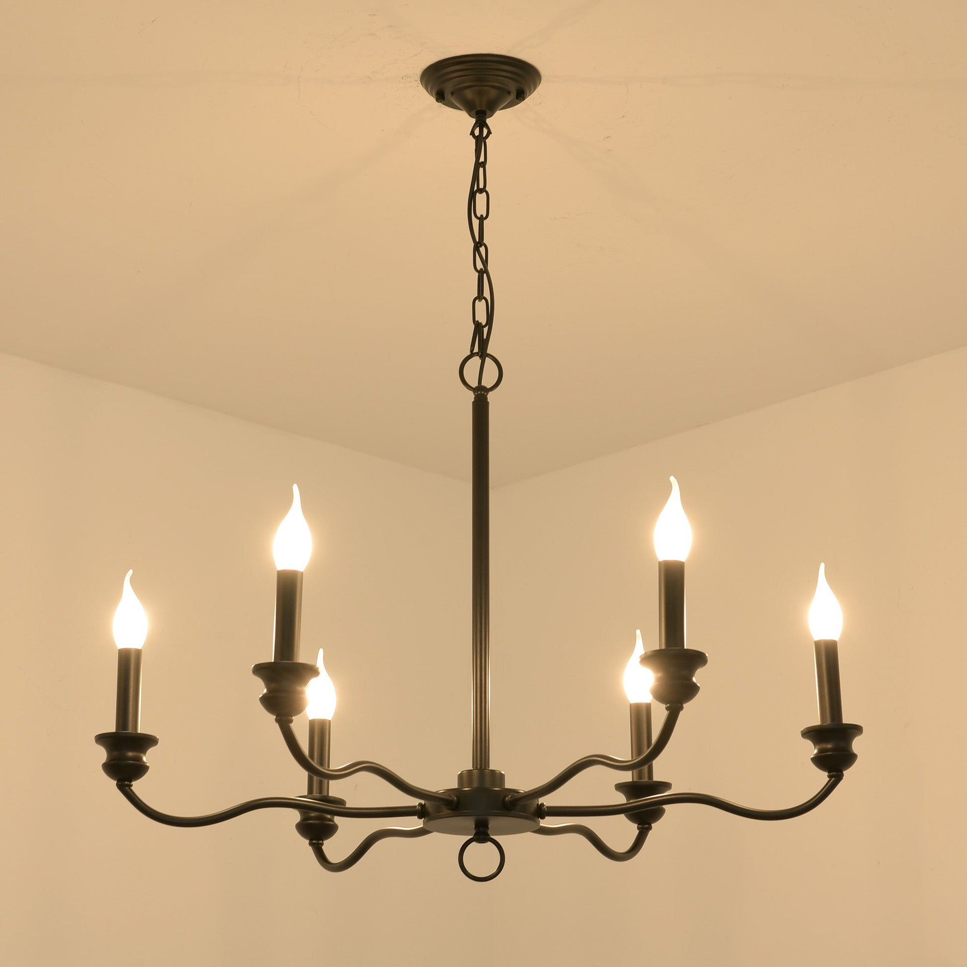 Classic Style:Chandelier crafted of iron in a black metal finish, features 6 candle-shaped stems placed on simply curved iron arms. With the combination of modern luxury and retro texture design style, it will perfectly embellish your farmhouse.