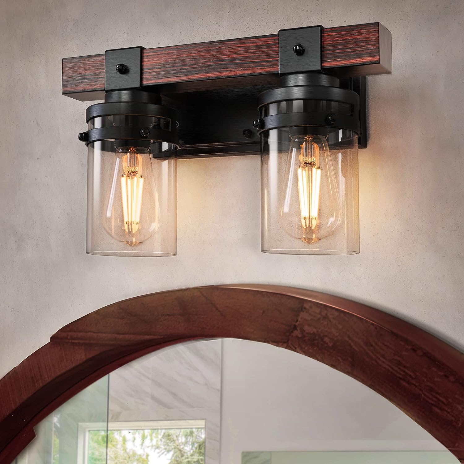 Bathroom Light Fixtures,DORESshop Rustic Farmhouse Vanity Lighting 2-Light Wood Grain Finish Wall Sconce Clear Glass Shades Over Mirror for Dressing, Bedroom, Bathroom,Hallway