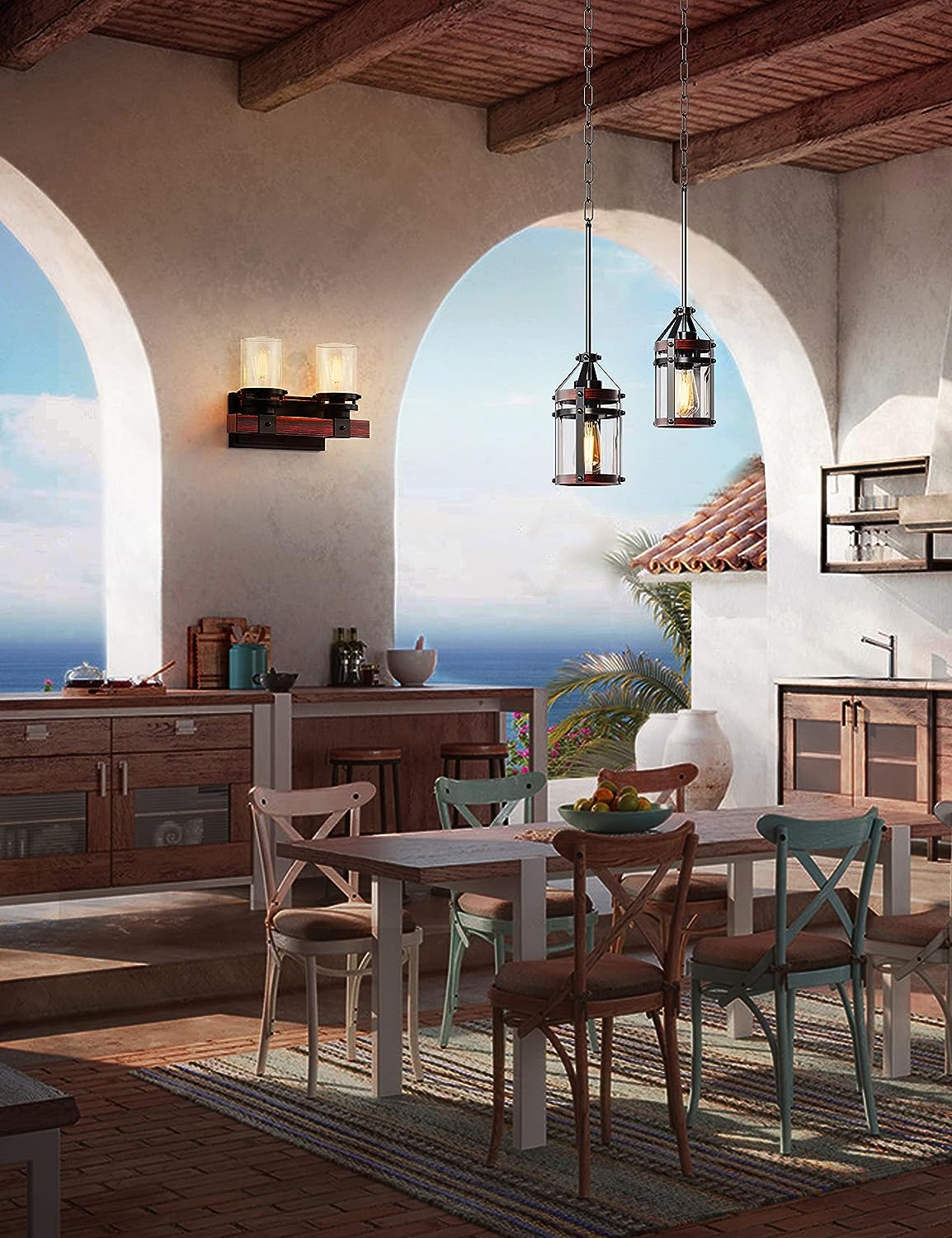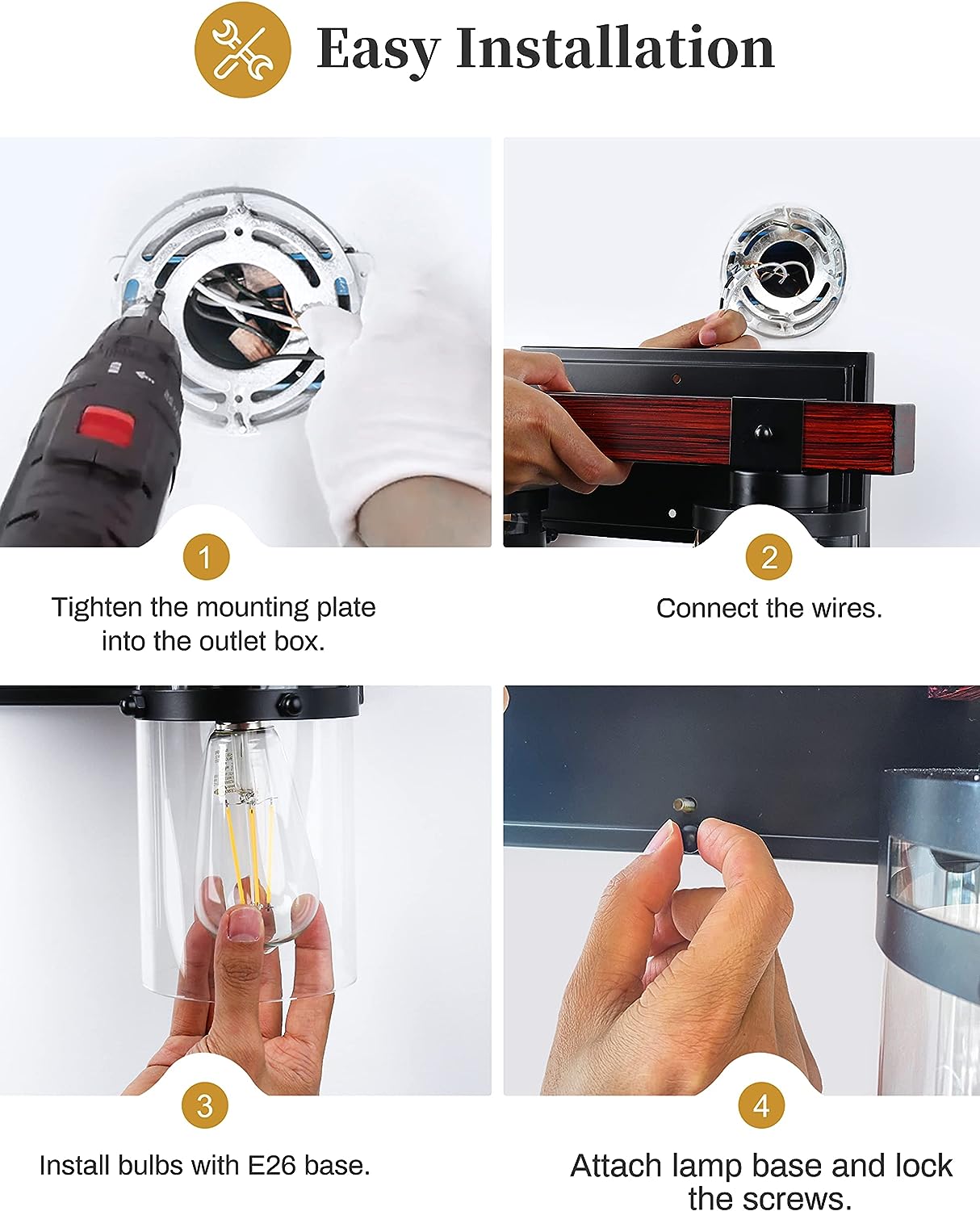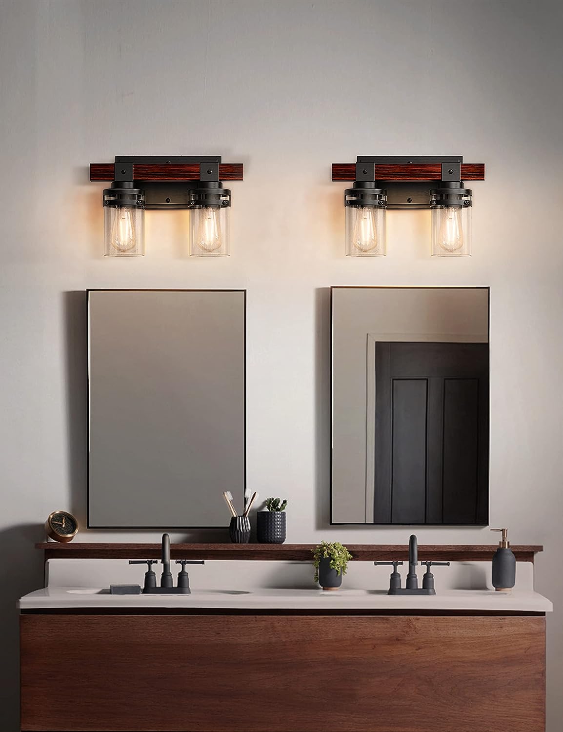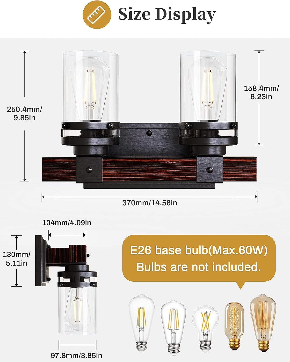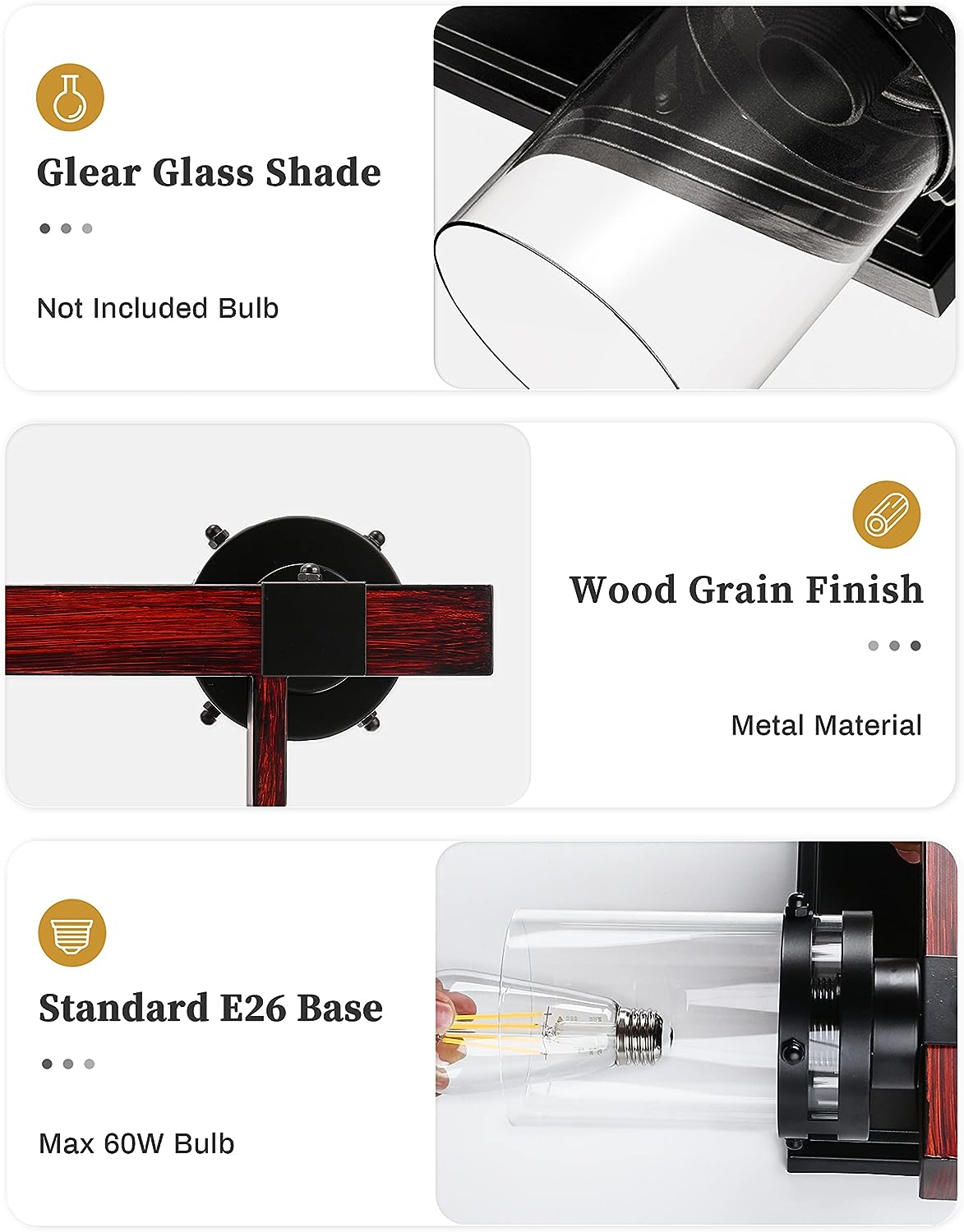 - Super Quality: Distressed black with wood tones , attractive faux wood finishand metal combination, composed of thicken transparent glass lampshades, not only prevents rust, but also brings a touch of rusticity to the bathroom light fixtures the elegance.
