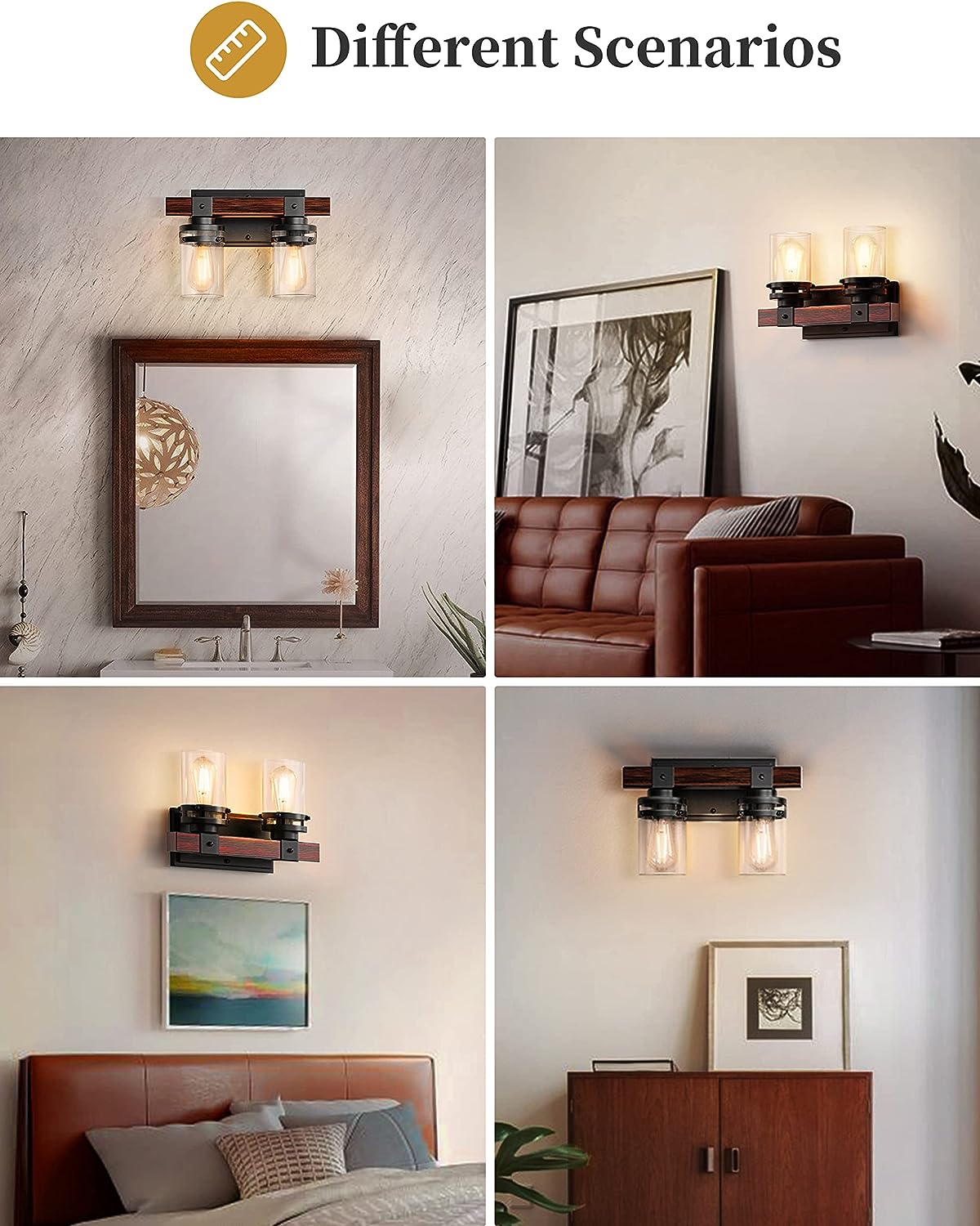 - Retro Wood Grain Design:2-Light farmhouse vanity lightingare a perfect fusion of traditional and country styles ,the imitation wood veneer complements the distressed black veneer of the backing and decorative parts add a touch of art to the dressing table lamps.