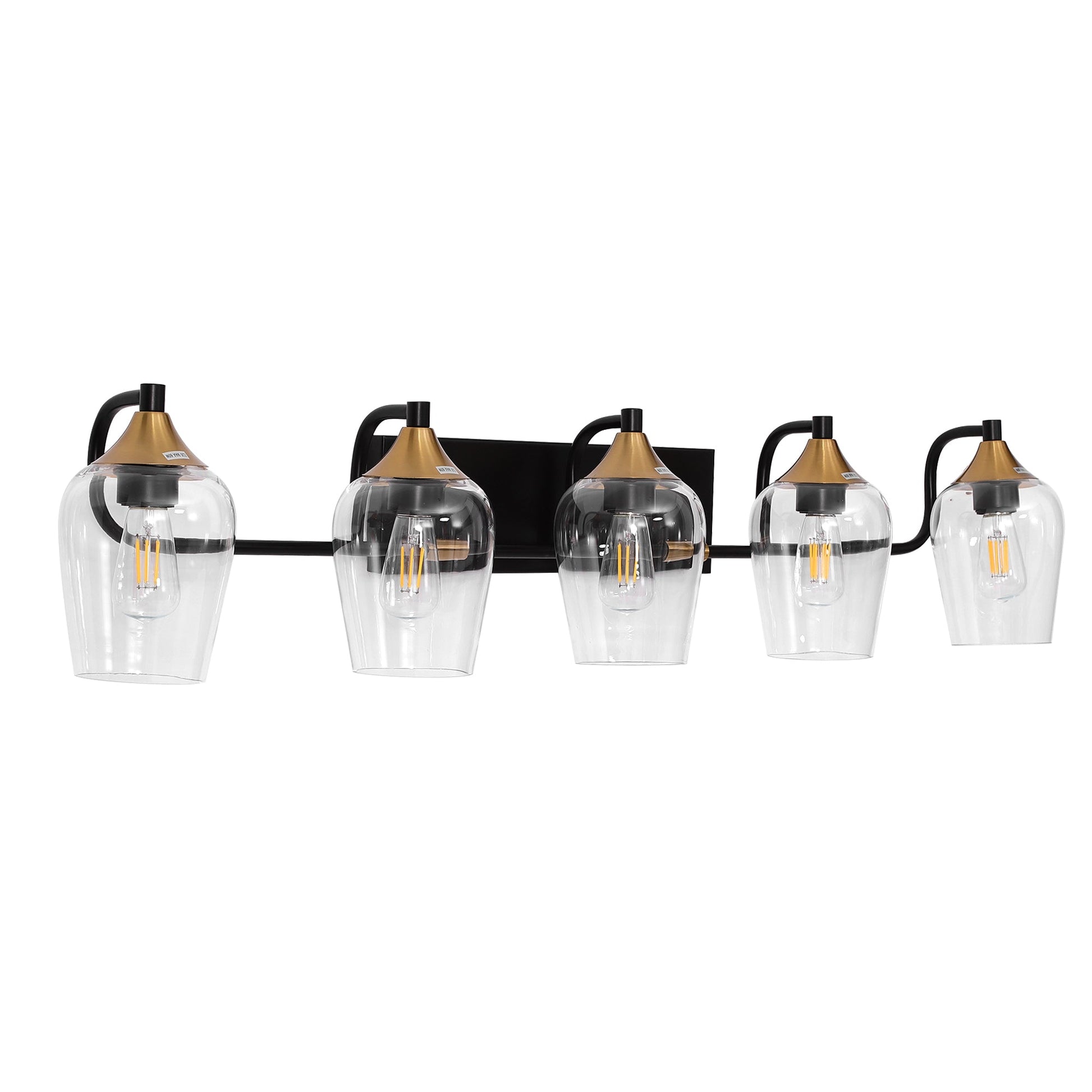 With a keen eye for style, this 5-light vanity offers a sophisticated way to style a modern master or guest bathroom space. Matte black and brilliant chrome provide a stunning finish to the elegant light fixture, offering geometric silhouettes framed by a stylish compact vanity. Accent backplates and square base light fixture brackets add to its beauty.
