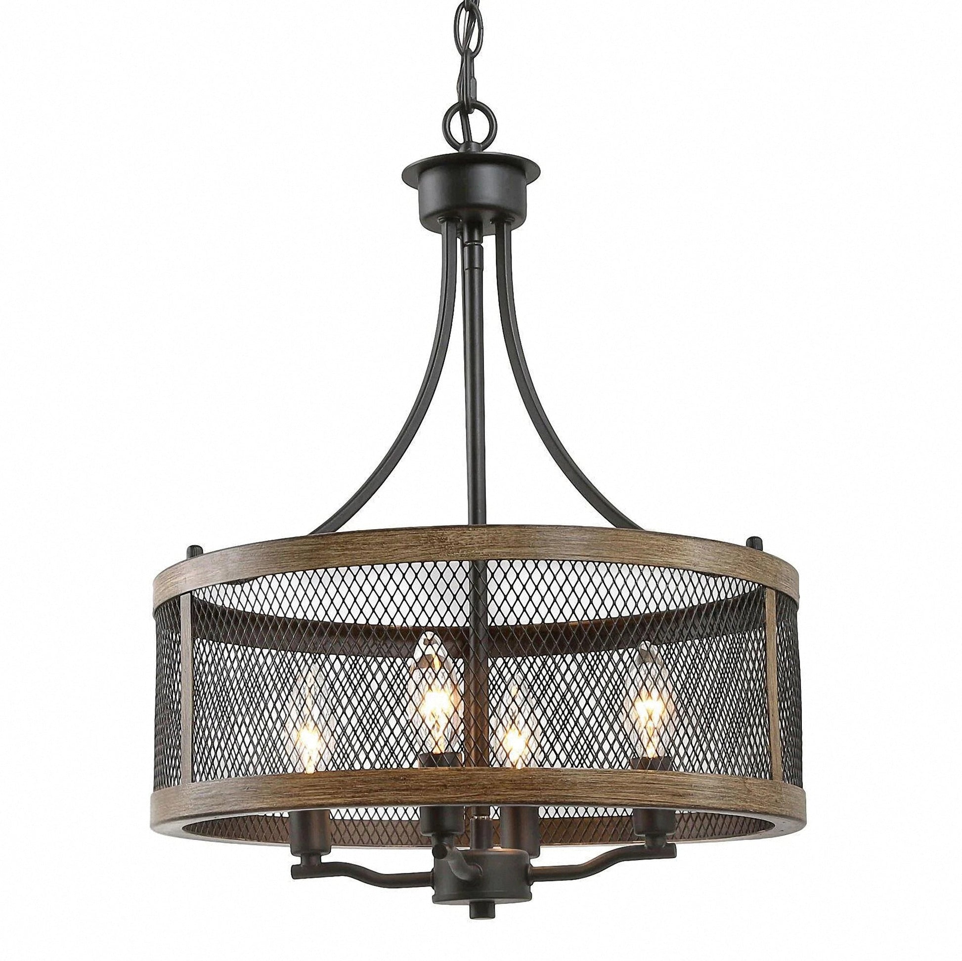 Black Caged Chandelier, Farmhouse 4-Light Drum Bronze Modern Round Chandelier Island Pendant Light with Faux Wood Accent