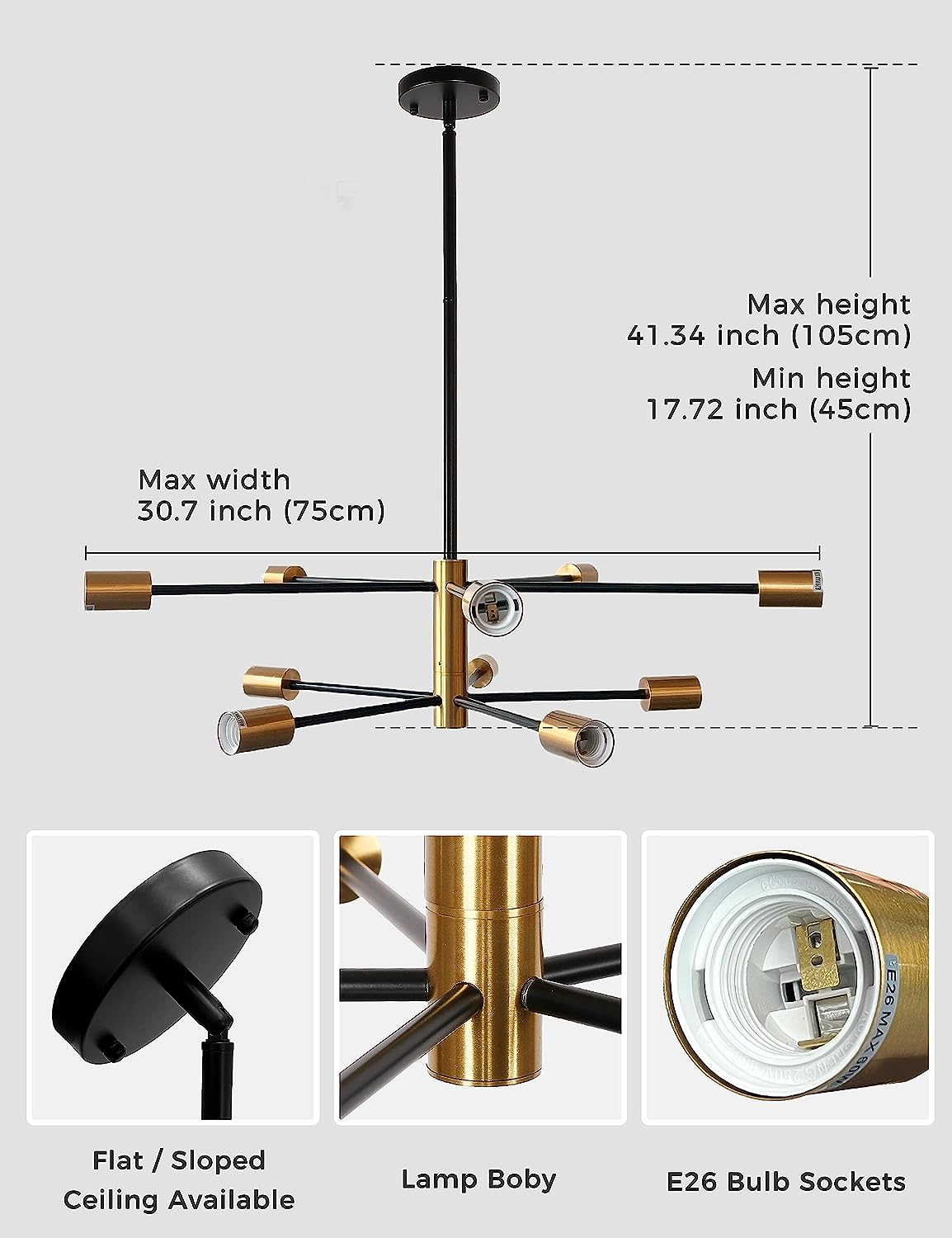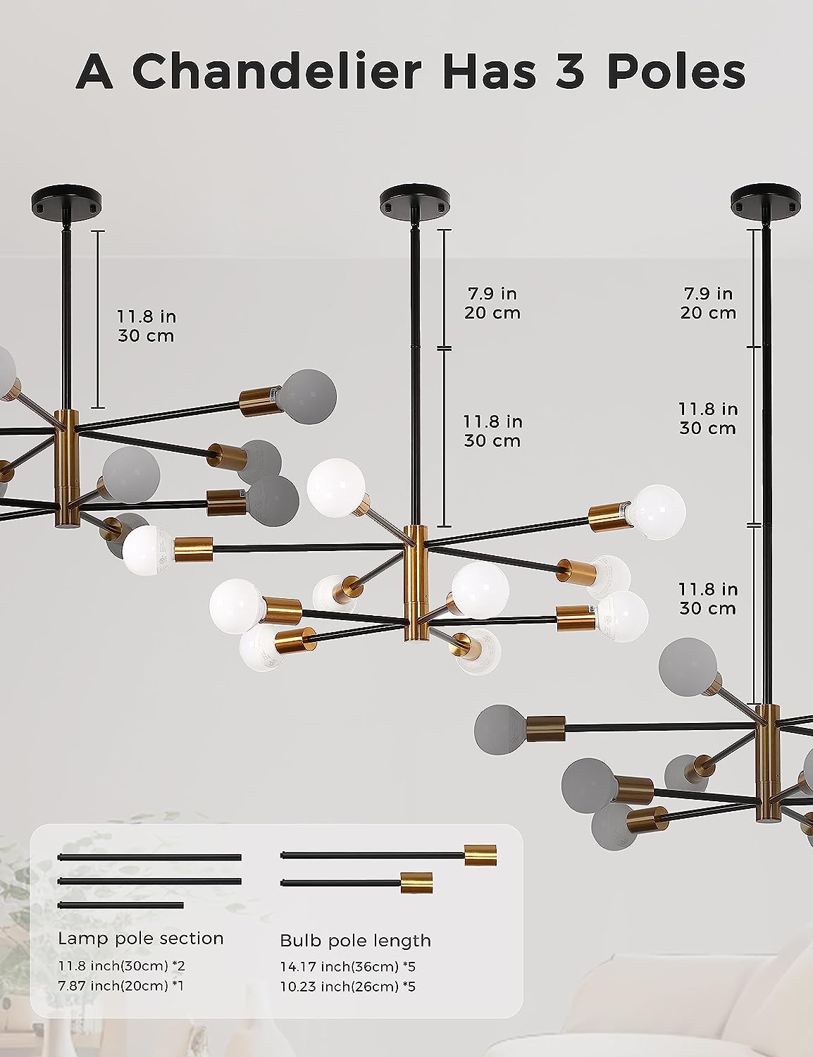 - 【Adjustment of Desired Height】 The mid century sputnik light fixture has 3 extension rods, total 40.6"H adjustable length (including 2 × 11.8" and 1× 7.87" rods). You can adjust the hanging height to cater your needs.
