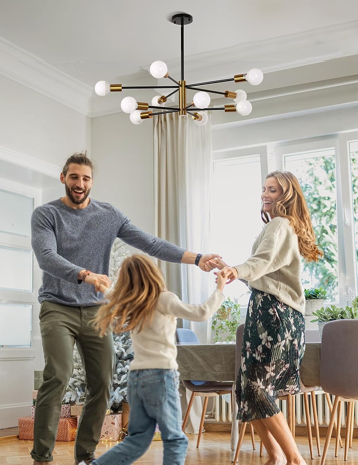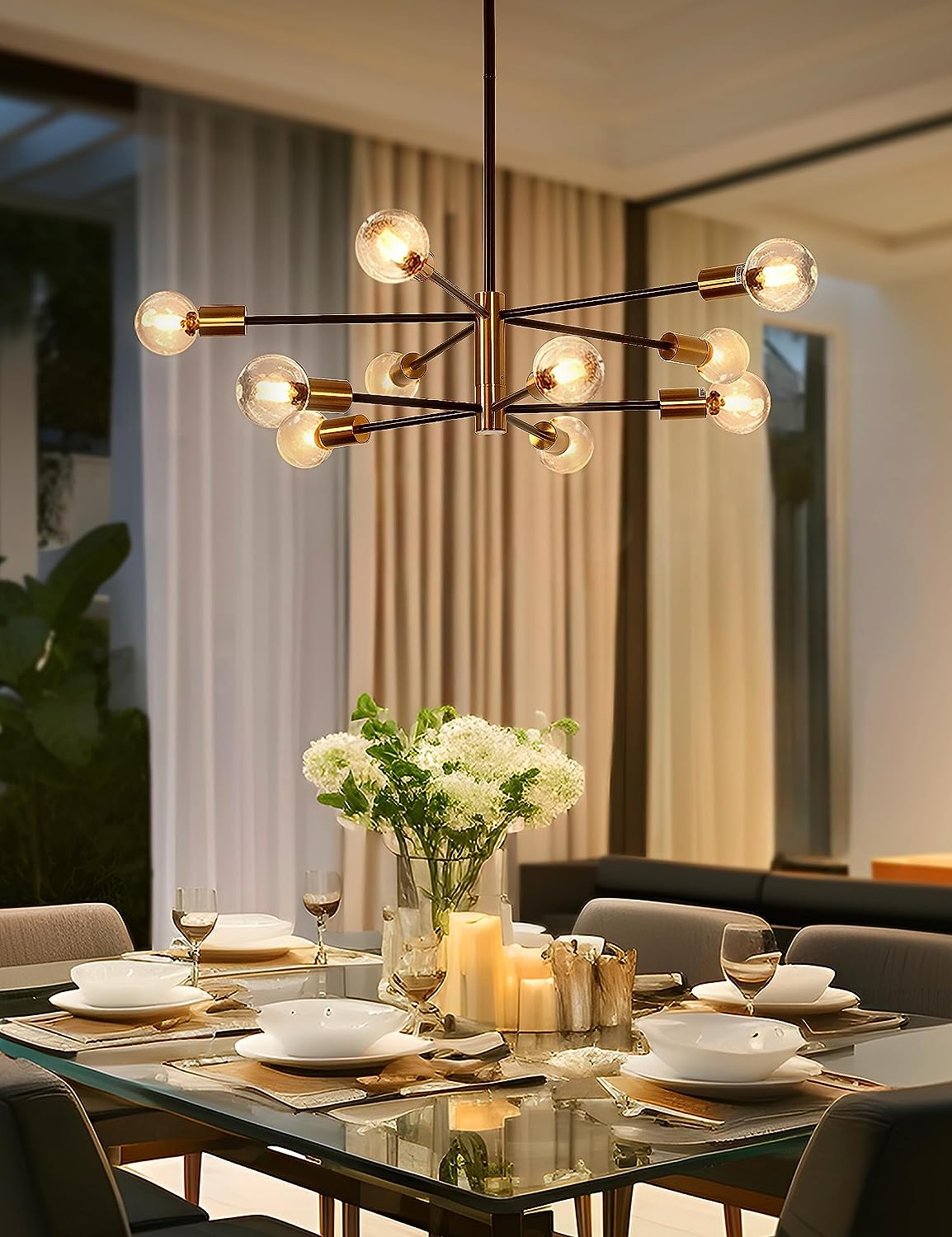 DORESshop Modern Sputnik Chandelier -10-Light Ceiling Light Fixture Height Adjustable Mid Century Plating Finished Black and Gold Chandeliers for Dining Room Living Kitchen Foyer