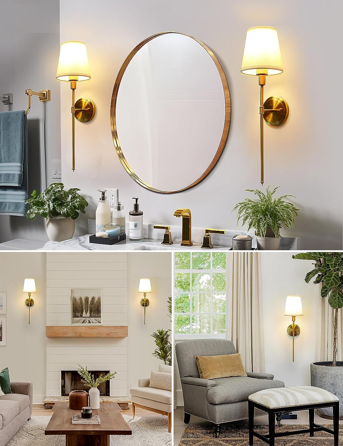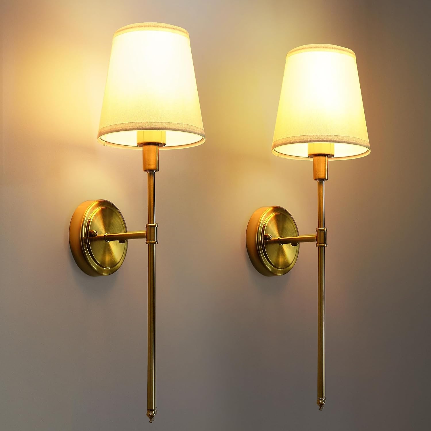 - 【Multi-Scene Application】 The sconces wall lighting is made of metal material, Classic Brushed Brass finish, long column arm and flared white fabric lampshade, bringing a retro and elegant atmosphere, ideal for bathroom vanity, living room, bedroom, dining room, stairs, hallway.