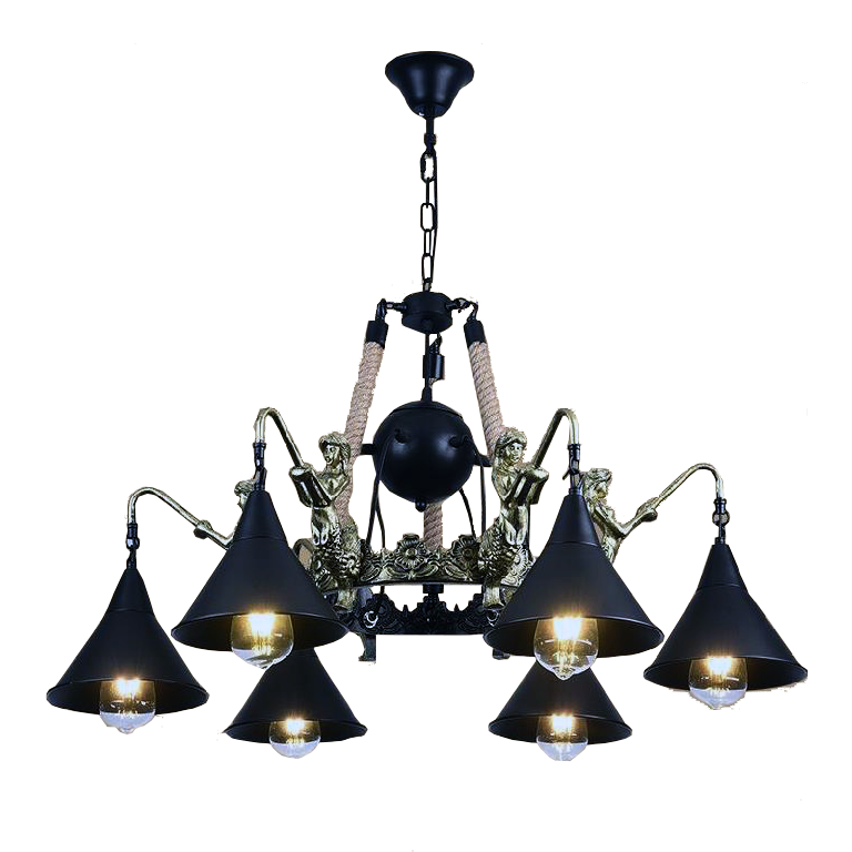 Brighten up your space with majestic style with this elegant six-light mermaid chandelier! The frame of this lamp is made of high-quality metal with a dramatic silhouette of a fairy tale, featuring moving mermaids pulling a flared black shade. Install 6*60W ST64 bulbs (bulb not included) to not only brighten your home but also decorate your retro style home.