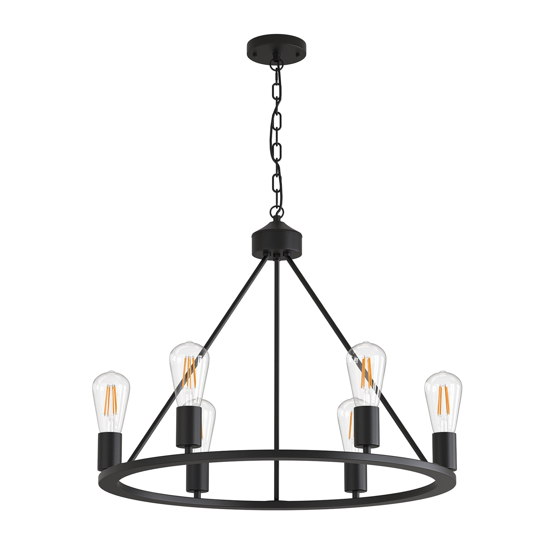 1.?Special?wagon wheel shape: Black-finished wagon wheel supports six E26 lights above. The special design makes this 6-light chandelier exude a modern and industrial sense, which is a perfect addition to home and commercial lighting.