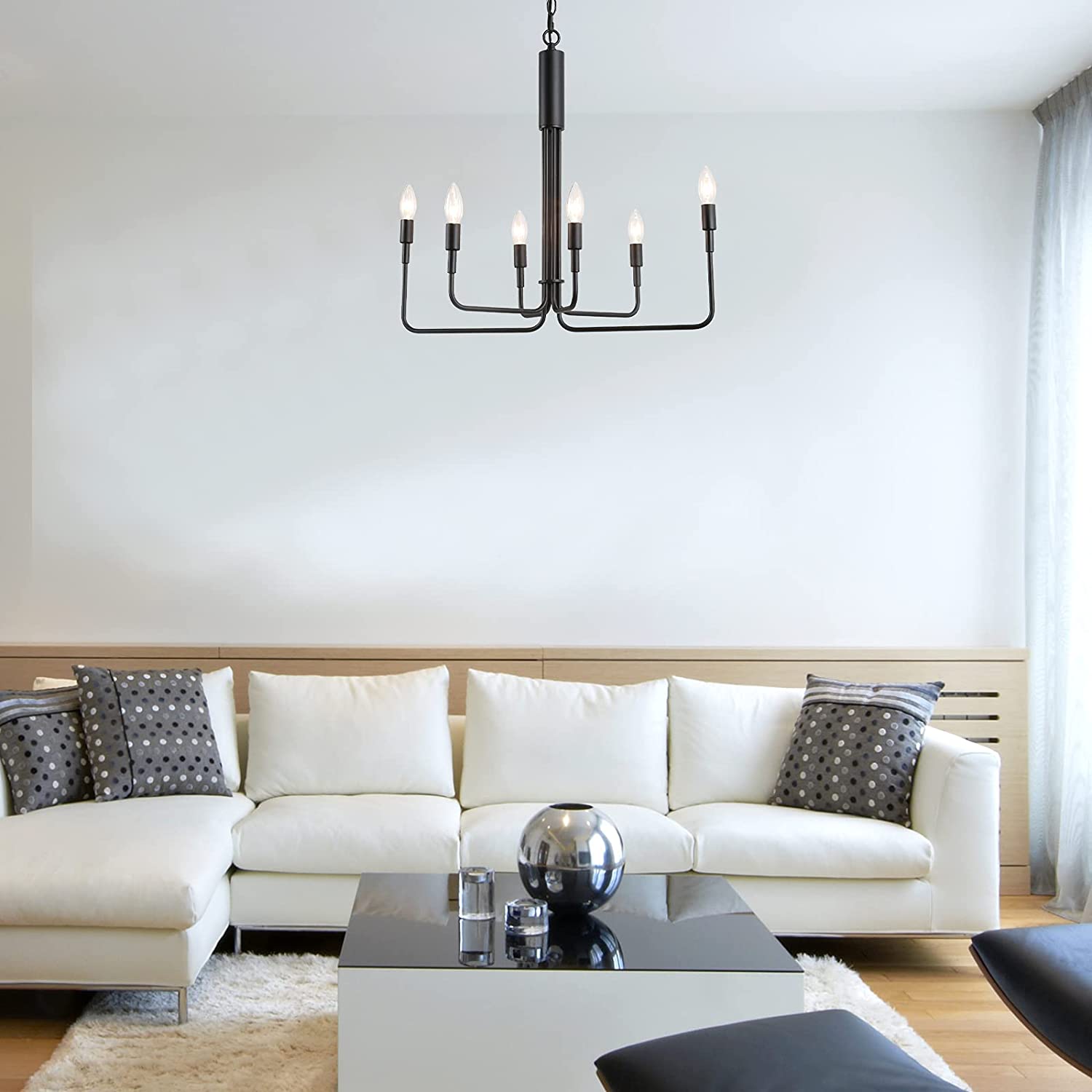 Simple design:This pendant chandelier with 6 evenly distributed fixture arms and classic candlestick element adds a modern yet soft, industrial flair to space.